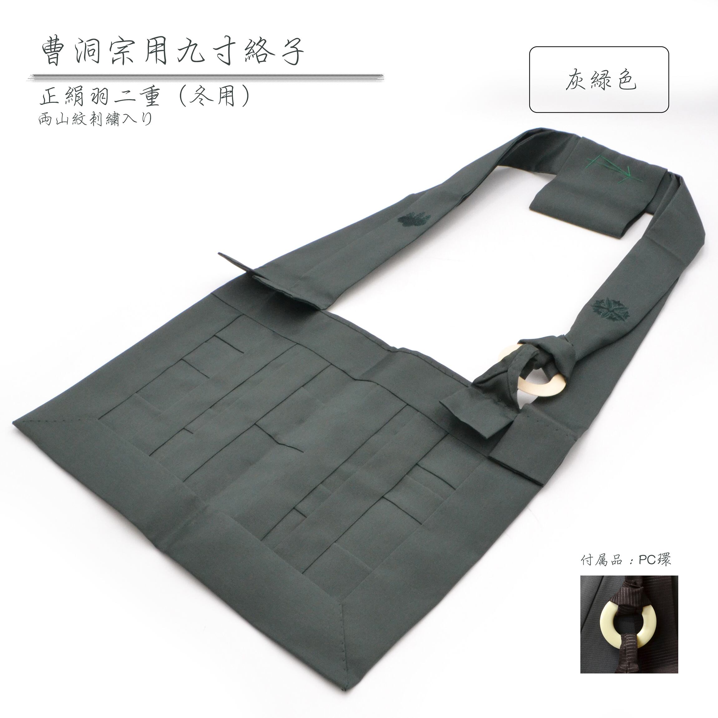 絡子 九寸仕立 曹洞宗 正絹 羽二重 灰緑色 両山紋刺繍 法衣 寺院用仏具