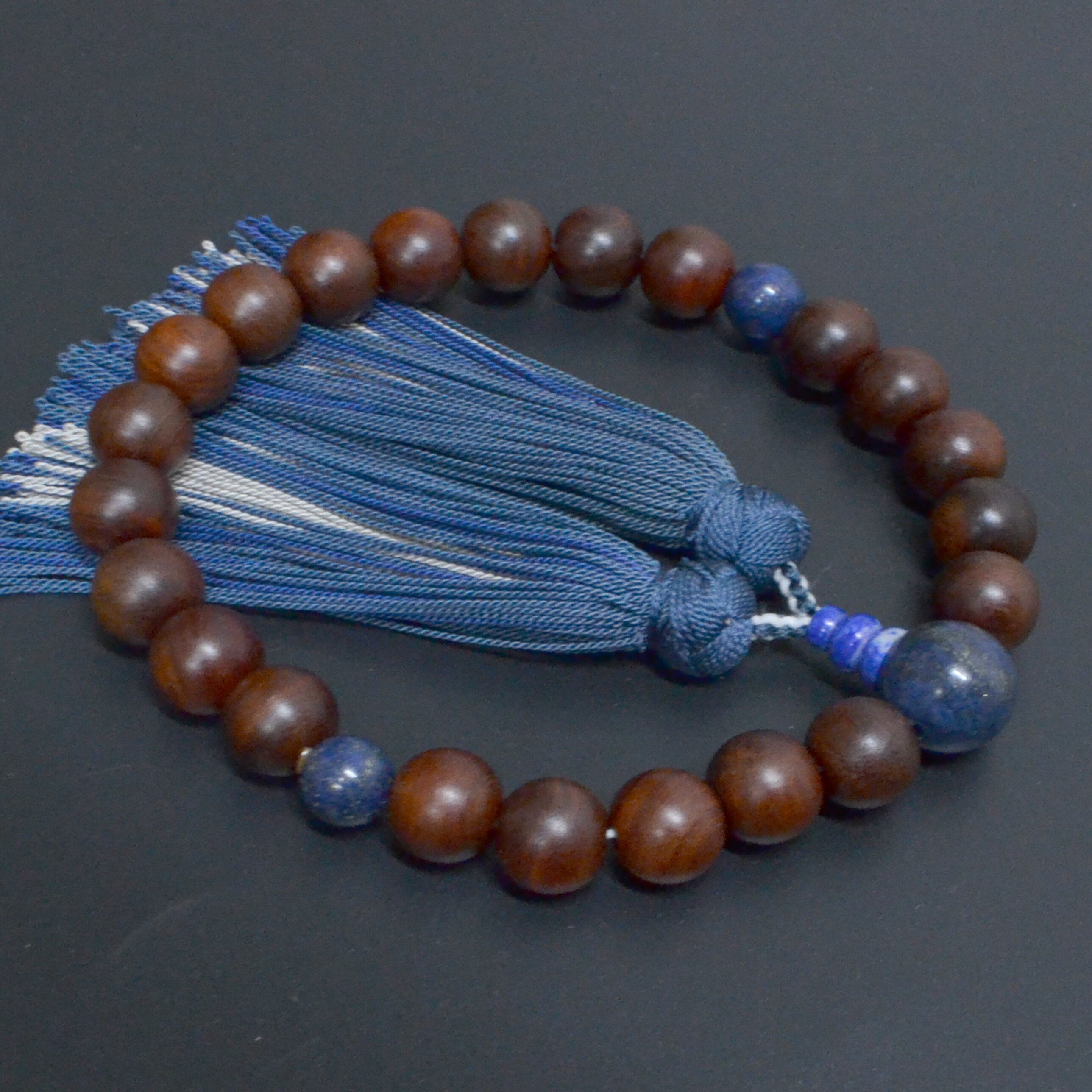 素引きと言われる艶なし紫檀にラピスラズリのアクセントがとても華やかで美しい数珠です。